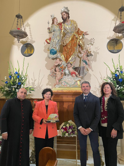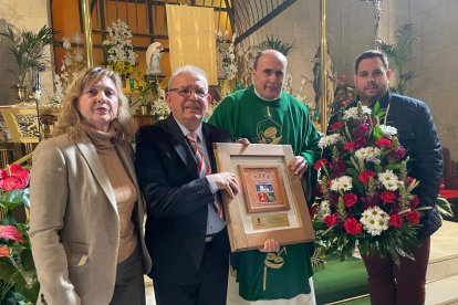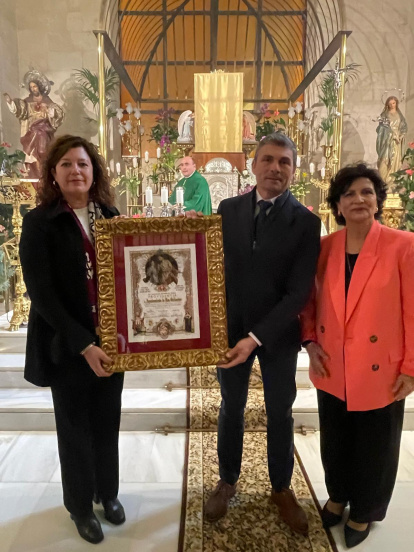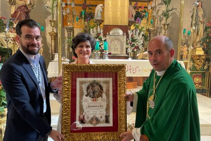 Álvaro Izquierdo, alcalde de Enix, recibe un recuerdo de la peregrinación ante San José de manos de Carmen Navarro, presidenta de Providentia.
