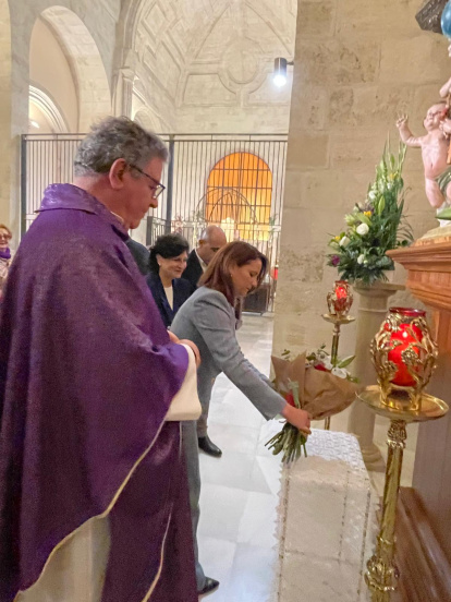 María del Mar Alfonso, alcaldesa de Albox, deja flores a los pies de San José.