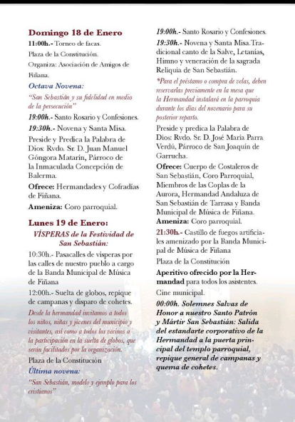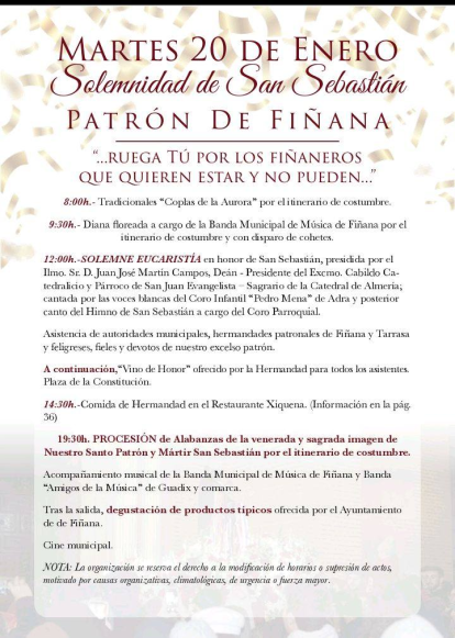 El ambiente irá creciendo hasta llegar al martes 20 de enero, Día de San Sebastián, cuando se celebrará la solemne eucaristía (12:00 h), el tradicional vino de honor en la Plaza de la Constitución, la comida de hermandad y la esperada procesión final (19:30 h), acompañada por las bandas de Fiñana y Guadix. Como es habitual, no faltará la degustación de productos típicos para cerrar la jornada.