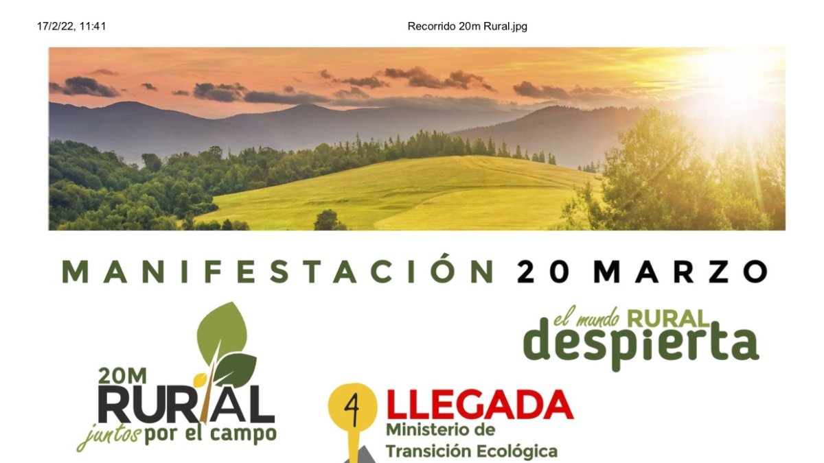 A la espera de la confirmación definitiva del recorrido por parte de la Delegación del Gobierno, esta movilización tiene previsto partir desde la Puerta de Alcalá a las 11 de la mañana para continuar por el Paseo de la Castellana y finalizar en la fuente de San Juan de la Cruz, a la altura del Ministerio para la Transición Ecológica y Reto Demográfico (MITECO), donde se llevará a cabo la lectura del manifiesto que recoge las reivindicaciones de todos los convocantes.