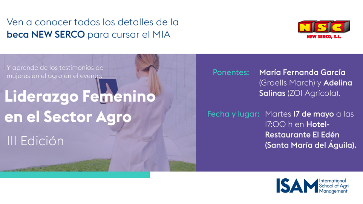 Durante esta jornada, se conocerá en profundidad el Máster Internacional en gestión de Agronegocios de ISAM, el MBA del Agro, que comienza el 16 de septiembre, y todos los detalles de la beca NEW SERCO. Esta beca tiene el objetivo de reivindicar el papel de la mujer en el sector agrícola y está dirigida a mujeres que quieran liderar el sector especializándose en Agronegocios. Las beneficiarias de esta beca, podrán obtener un descuento del 50% del coste total del máster.