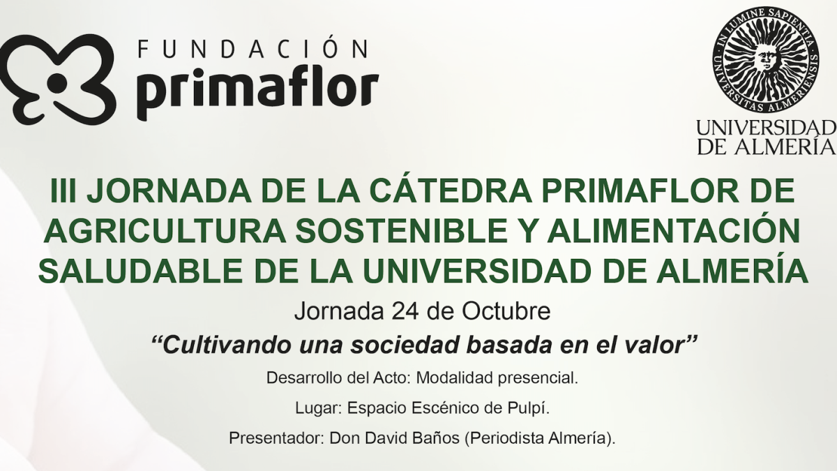 La Fundación Primaflor celebrará el próximo 24 de octubre de 2023, la III Jornada de la Cátedra Primaflor de Agricultura Sostenible y Alimentación Saludable de la Universidad de Almería bajo el nombre “Cultivando una sociedad basada en el valor” que se desarrollará en el Espacio Escénico de Pulpí (Almería).