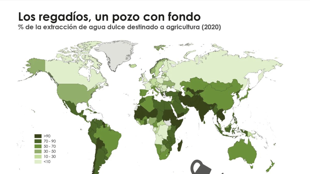 El agua dulce que se destina a los regadíos alcanza un 70%, superando el 95% en algunos países