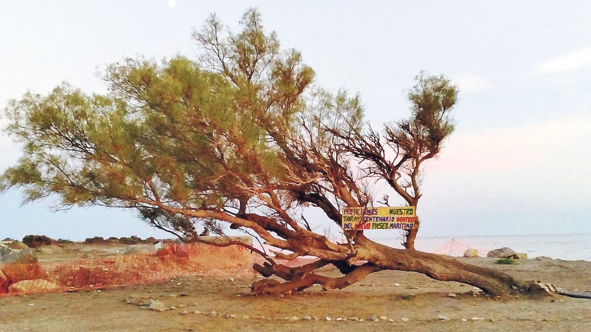 Este rarísimo árbol que podemos ver en las frustradas (por el momento) obras del Paseo Marítimo, estuvo durante muchísimos años en el jardín particular de uno de los chalets que había en la playa del Quinto Pino. No lo parece pero es más que centenario; de ahí que fue el único que se respetó cuando se derribaron estos chalets hace un par de décadas para ampliar el Paseo. El propietario escribió en el tronco algo que veremos mañana.
