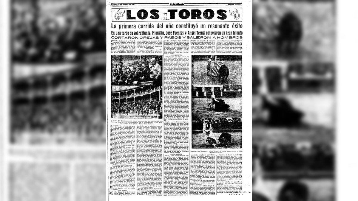 La Voz del día siguiente ofrecía estos titulares: ‘La primera corrida del año constituyó un resonante éxito. En una tarde de sol radiante, Miguelín, José Fuentes y Ángel Teruel obtuvieron un gran triunfo. Cortaron orejas y rabos y los tres salieron a hombros’.