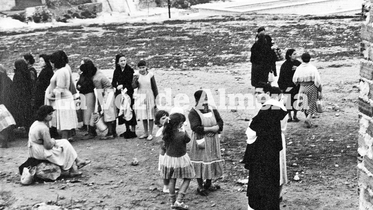 La fotografía de esta página nos cuenta una historia, la de tantas mujeres del barrio de la Chanca que se encontraban con Dios cuando iban al Centro de Asistencia de Cáritas Diocesana que en 1957 abrieron en el paraje de la Fabriquilla. En las largas colas que se formaban antes del amanecer, desafiando el frío y el viento, solo había mujeres y niñas, que con sus cestas aguardaban el momento del milagro. En la fotografía destaca la presencia de un religioso vestido con hábito, que es contemplado como si fuera un santo apóstol por una de las mujeres que se habían apartado de la cola para admirar al cura. La mujer parece centrar su atención en la ropa del marianista, tan limpia, tan bien planchada, tan fuera de contexto para aquellas mujeres que no habían conocido todavía lo que era plancha eléctrica ni un cuarto de baño moderno.