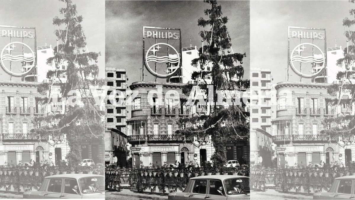 Todavía no había sido derribada la casa que hacía esquina con la Rambla de Alfareros donde estaba la popular ferretería de Vulcano. En el terrao del edificio se colocó por aquellos años un espectacular anuncio luminoso de la casa Philips. Detrás asomaban los pisos del edificio Tauro, que representaba las nuevas formas arquitectónicas.