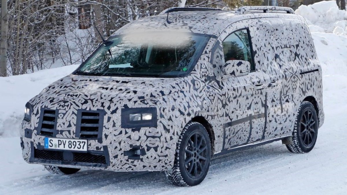 Podemos apreciar en las primeras fotos espía, las lamas de la parrilla del radiador, algo más trapezoidal como en el modelo Sprinter, aunque a una escala menor, y el nuevo diseño de los faros, que ahora son en forma de cuña, muy similar al de los turismos de la marca, también se aprecian nuevas barras en el techo en la variante de pasajeros del nuevo Citan Tourer, y la otra, el Citan Van, el comercial puro y duro que ofrece los laterales panelados, los dos modelos disponen de puertas laterales correderas para acceder más fácilmente en lugares estrechos. También habrá diferentes longitudes, y puertas traseras dobles y asimétricas. Detrás parecen adivinarse los pilotos montados en los pilares del portón a media altura.