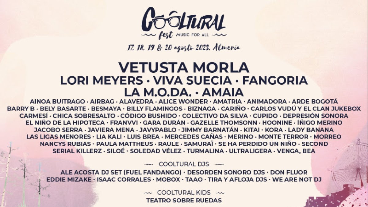 El evento este año que una vez más traerá lo mejor de la música en directo a Almería, contará con la participación de artistas y grupos como: Vetusta Moral, Lory Meyers, Viva Suecia, Fangoria, La M.O.D.A., Amaia, Second, Arde Bogotá, Raule, Cariño, Cupido, Amatria, Nancys Rubias o Siloé, entre otros muchos artistas. Además este año el festival contará con diferentes DJ,s y Cooltural Kids.