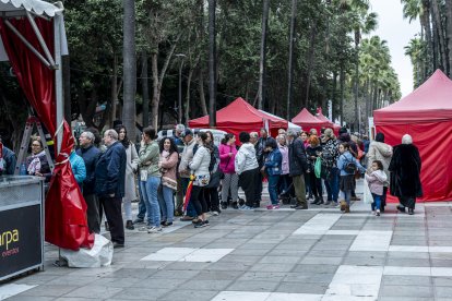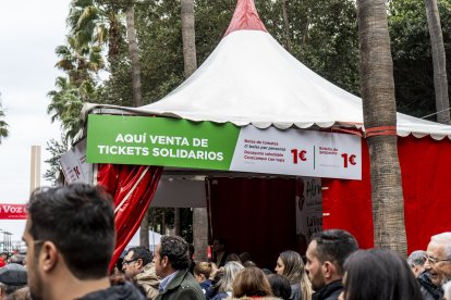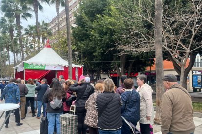 Cola de gente esperando su turno para comprar los tiquets solidarios.