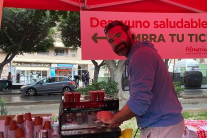 Una almeriense disfruta del desayuno solidario, con pan Hidalgo y café Salvador