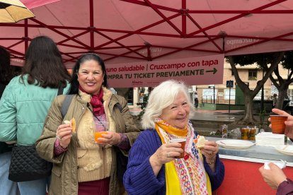 Dos voluntarias de la Asociación ANDA con la tapa solidaria, con Cárnicas Campohermoso.