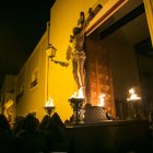 Uno de los momentos más destacados del Vía-Crucis llegó en la calle Silencio, donde los vecinos lanzaron pétalos de flores. Único adorno floral que luce las austeras andas fúnebres que portan al Santo Cristo del Perdón y de las Lluvias e iluminado por cuatro pebeteros de fuego.