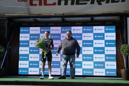 Ally Wollaston celebra el éxito en la III Clásica Ciclista de Almería Femenina.