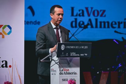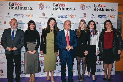 Diego Martínez, responsable del IAJ en Almería; Paola Laynez, concejal del Ayuntamiento de Almería; Loli Martínez, delegada de Fomento; Pedro M. de la Cruz, director de LA VOZ; Antonio Bonilla, alcalde de Vícar; Matilde Díaz, diputada provincial; Laura Martínez, presidenta de LA VOZ; y Ricardo Céspedes, gerente de LA VOZ.