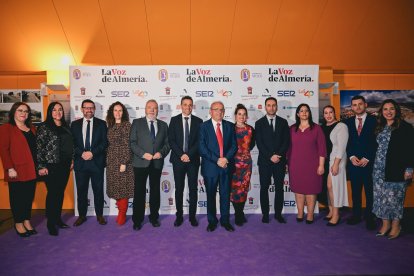 Gran foto de familia en la que aparecen autoridades almerienses junto al staff de LA VOZ en el photocall de los I Premios de la Mujer en Almería.