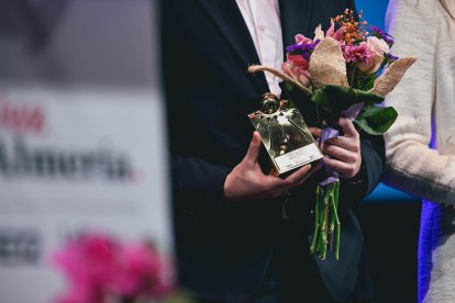 La premiada en la categoría de Conocimiento, Araceli Rivera, recibe el premio de las manos de Diego Martínez, responsable del IAJ en Almería.