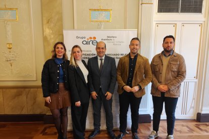 Pepe González, de AIRE Consultores, en el centro. A sus lados, Alejandra Abad, Ana Belén Carrión, Antonio Miguel López y José Andrés Soriano, todos de AJE Almería.