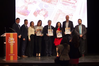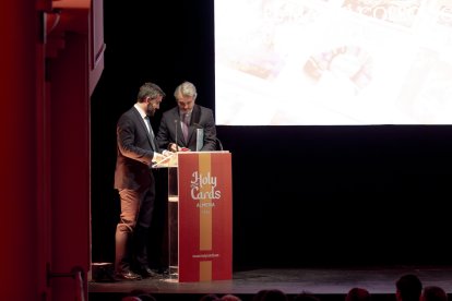 Colas a las puertas del Teatro Apolo, aforo completo, expectación... Las Holy Cards, el primer coleccionable de cromos de la Semana Santa de Almería, fueron presentadas en la noche de este lunes en el céntrico teatro almeriense en un acto que sirvió de termómetro para comprobar que la iniciativa, impulsada por Juan Carlos Ramos Picchi y Javier Ayala, ha causado auténtico furor incluso antes de llegar kioscos de la provincia.