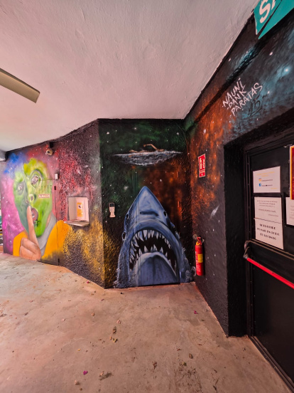 Una de la paredes del hall decorada con la imagen de Tiburón.