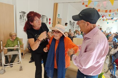 Victoria en el salón de la Residencia de Mayores de El Zapillo, rodeada por otros residentes y sus seres queridos.