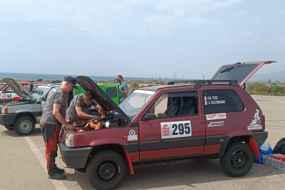 Los italianos Toso y Riccomagno revisan el motor de su Fiat Panda.