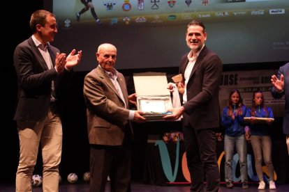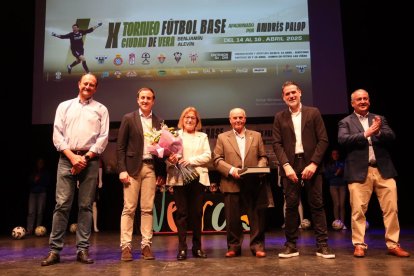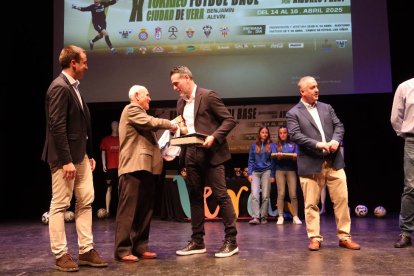 El Auditorio Municipal 'Ciudad de Vera' ha acogido este lunes la presentación del X Torneo de Fútbol Base 'Ciudad de Vera', un evento que este año cuenta con un padrino de lujo: el exfutbolista Andrés Palop. Durante el acto se reconoció la labor del presidente del Club Deportivo Vera, Juan López, quien recibió una distinción por su trayectoria.