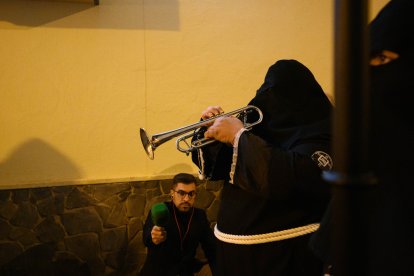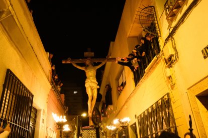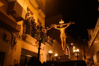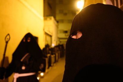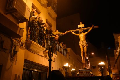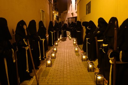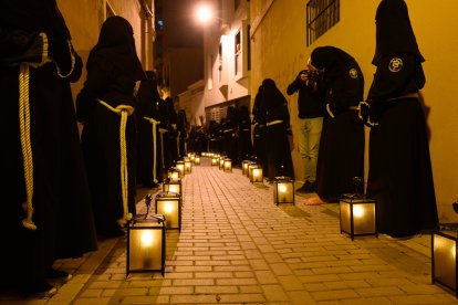 La Hermandad Juvenil del Santo Cristo del Perdón realiza su tradicional vía-crucis penitencial de silencio por las calles de Almería en una de las imágenes más emblemáticas del Martes Santo y de la Semana de Pasión de la capital.
