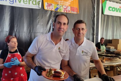 Juan José Rodríguez y Francisco Fernández repartiendo huevos fritos y chorizo.