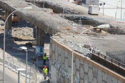 Vista de los trabajos de demolición del puente de la Avenida del Mediterráneo desde abajo