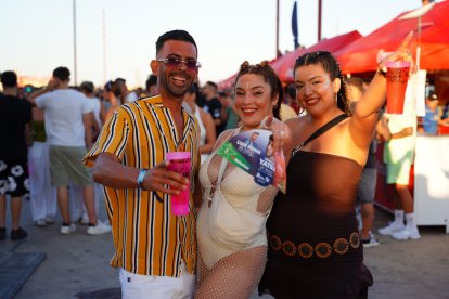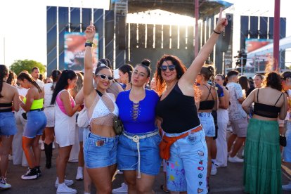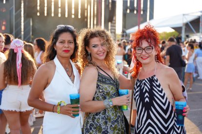 Tres amigas posan frente al escenario de Puro Latino de Almería.