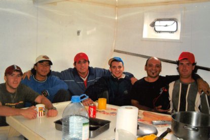 Los marineros del palangrero de superficie durante las labores de preparación de rancho a bordo