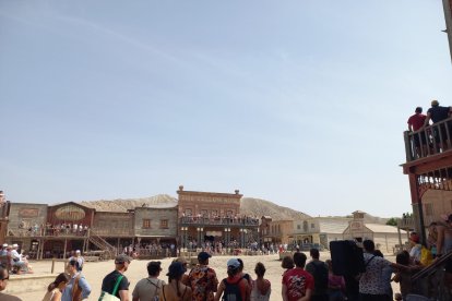La plaza del poblado llena de gente para ver la actuación de los especialistas en el Oasys Mini Hollywood de Tabernas