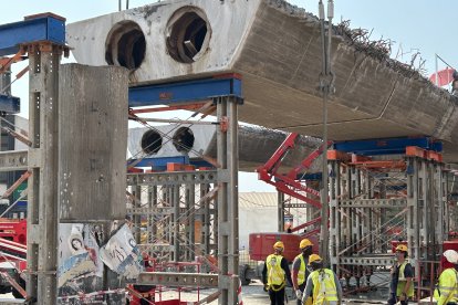 El trabajo de los operarios, pese a la magnitud y complejidad de las obras, cada vez es más eficiente. Mientras se procede al desmontaje de las piezas, otra grúa se ocupa de retirar las desmontadas previamente. Asimismo, al otro lado del puente siguen trabajando cortando con diamante el puente y reforzando la estructura con andamios. Por tanto, tres trabajos en un mismo lugar: partición del puente -en un extremo-, levantamiento de las piezas ya segmentadas -en medio- y la retirada de los bloques en camiones -al otro extremo-.