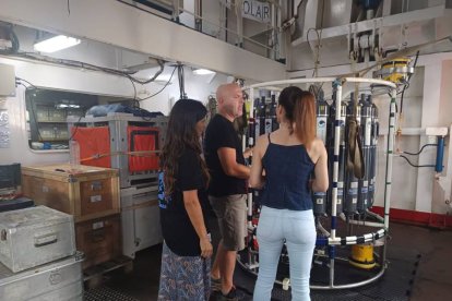 El buque oceanográfico Sarmiento de Gamboa, perteneciente al Consejo Superior de Investigaciones Científicas (CSIC), hace escala en el puerto de Almería. LA VOZ se ha subido este viernes a esta embarcación. De más de 60 metros, tiene capacidad para 46 personas, de las que 26 son tripulación de formación cientifica-técnica.