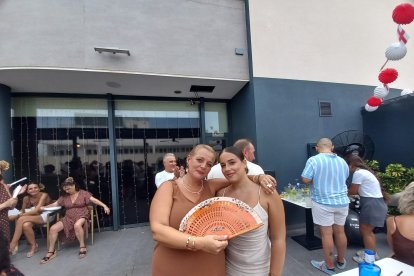 Mila Bello y Karen Sotelo posan para una foto mientras se desarrolla una 'conga' a su alrededor.