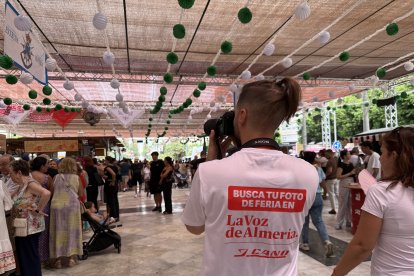 El fotógrafo de LA VOZ DE ALMERÍA, Bernardo Claros, con camiseta de J. Cano, sacando fotos de los ambigús de la Rambla.