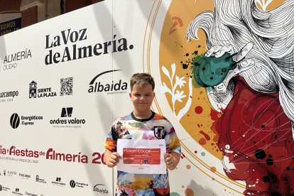 Luka, de 10 años, campeón de España y Toulouse en boxeo en la categoría Benjamín, posa junto a su bono de Almericolor, por su colorida vestimenta.