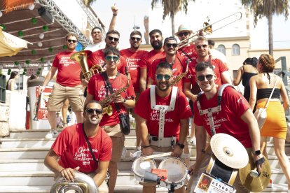 La charanga de LA VOZ DE ALMERÍA, con sus camisetas de MRW, amenizando el ambiente en los ambigús de la Rambla.