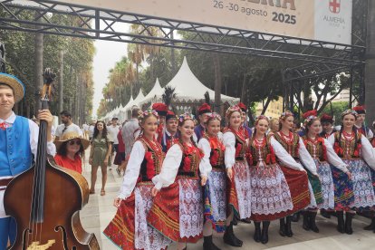 La charanga de LA VOZ DE ALMERÍA, con sus camisetas de MRW, animando las calles de Almería.