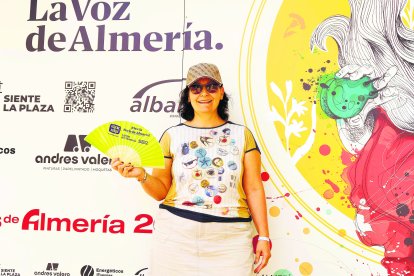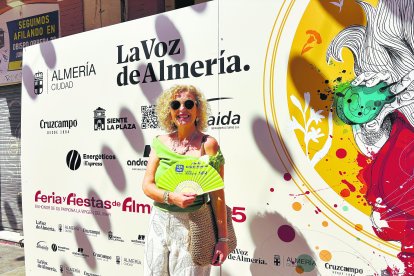 Ufuk Wulf, turca residente en Alemania, vino a Almería para hacer turismo, celebrar la Feria con su abanico ‘Look & Find’ y posar en el ‘photocall’ de LA VOZ en la Rambla.