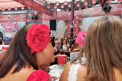 Las clientas del ambigú de Kuver Producciones, vestidos para la ocasión con flores en el pelo.