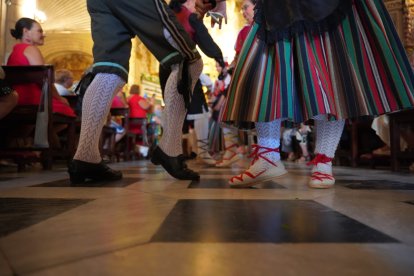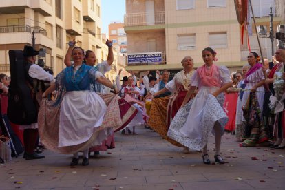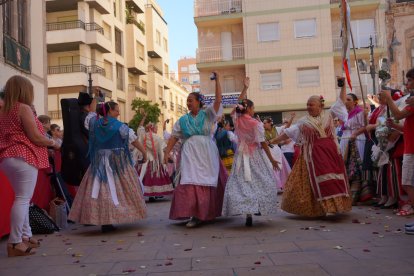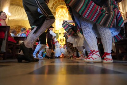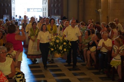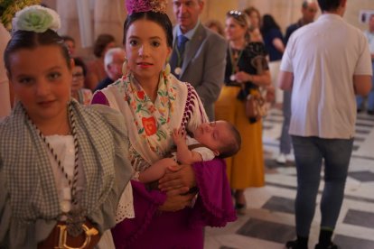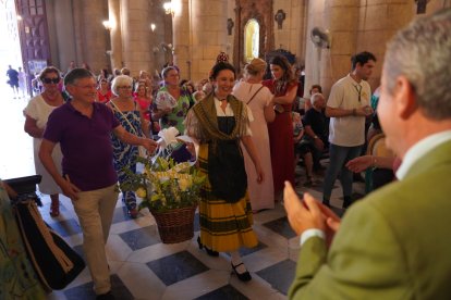 La alcaldesa de Almería, María del Mar Vázquez, vestida de refajona en la ofrenda floral.