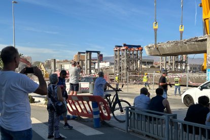Decenas de almerienses se han acercado para presenciar la retirada del último bloque que unía varios barrios de la ciudad desde 1987, fecha en la que fue construido, aprovechando para inmortalizar en sus teléfonos una estampa que guardarán en su recuerdo.