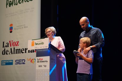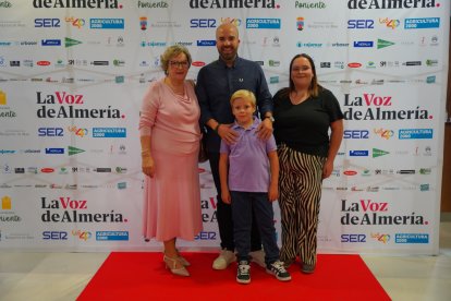 Encarna García Sánchez, jefa y cocinera del Bar Cahete junto a su hijo y nieto; recibiendo el premio de manos de José Carlos Lupión Carreño, alcalde del Ayuntamiento de Berja.