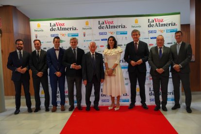 El alcalde de Adra, Manuel Cortés; el alcalde de Roquetas, Gabriel Amat; el alcalde de Enix, Álvaro Izquierdo; el vicepresidente de Diputación, Ángel Escobar; Pedro Manuel de la Cruz, director de LA VOZ; Ricardo Céspedes, gerente de LA VOZ; José Miguel Vizcaíno, director comercial de LA VOZ; Fran García, delegado de SER Poniente en LA VOZ; y Gema Salinas, consejera delegada de LA VOZ.