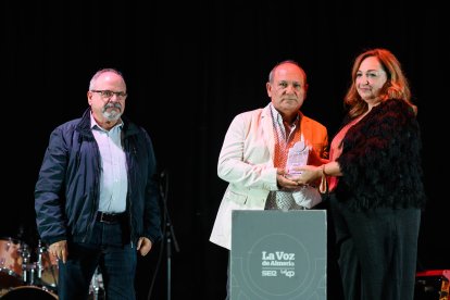 Olivier Martínez, de CM2000, junto al alcalde de Huércal de Almería, Ismael Torres, que ejerció de anfitrión en los décimos Premios del Andarax, y Sonia Giménez.