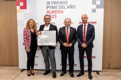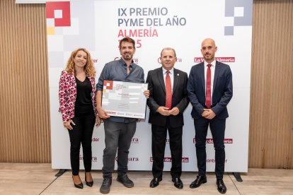 Cristina Minayo, de Santander; Jerónimo Parra, de la Cámara de Comercio de Almeria; y Francisco Luque, de La Voz de Almería, junto al premiado de Ecoinver Bio.