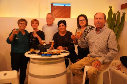 María Rosa Sánchez García y amigos de la rambla de Oria, brindando por su amistad.