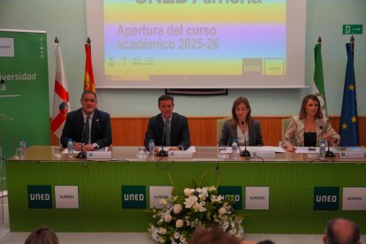 De izquierda a derecha, la directora de la UNED en Almería, María del Carmen Pérez; María Elisa Chuliá, vicerrectora de la UNED; Javier A. García, presidente de la Diputación; Javier Urra, psicólogo español invitado para dar la charla del acto; y Francisco Alonso, delegado territorial de Universidades en Almería.